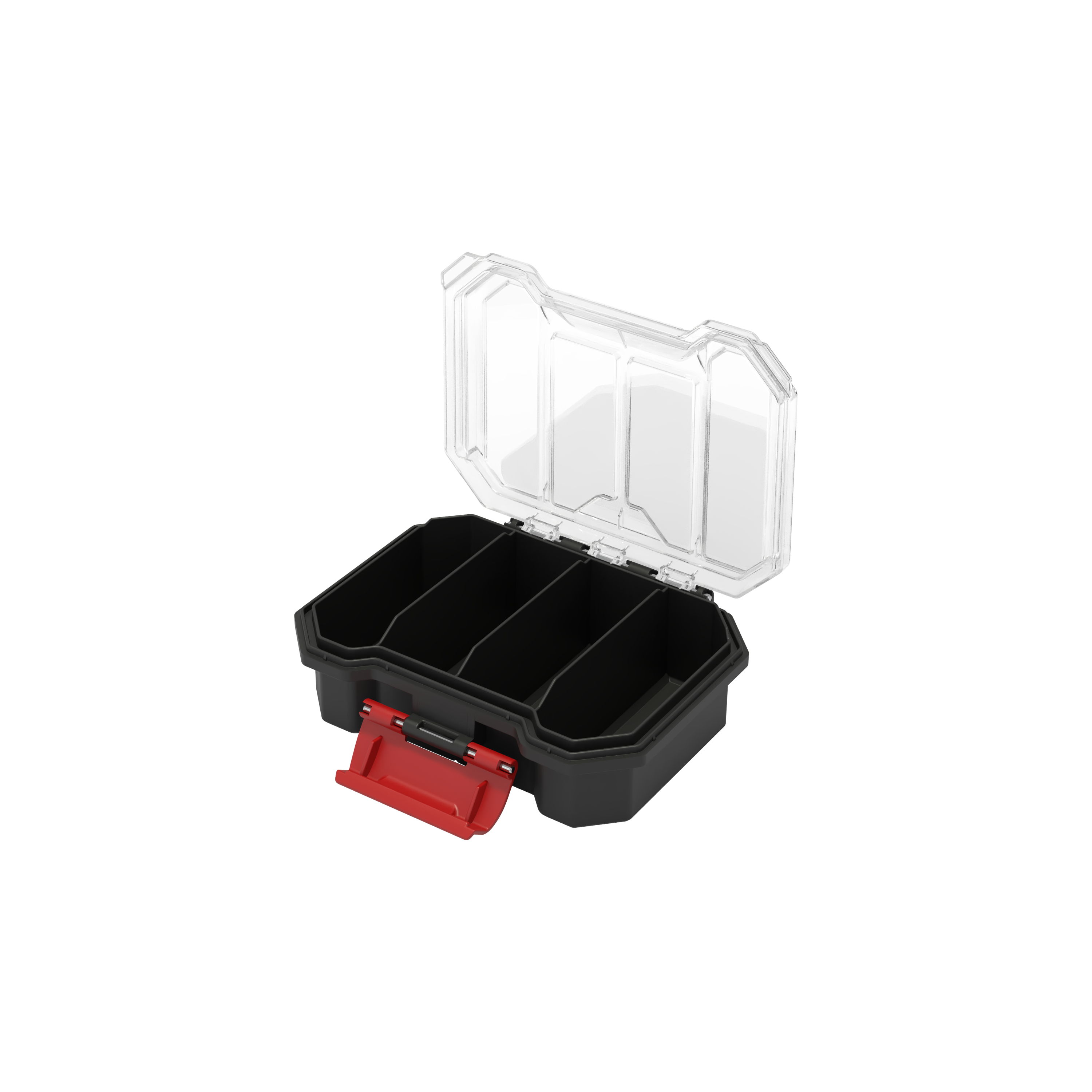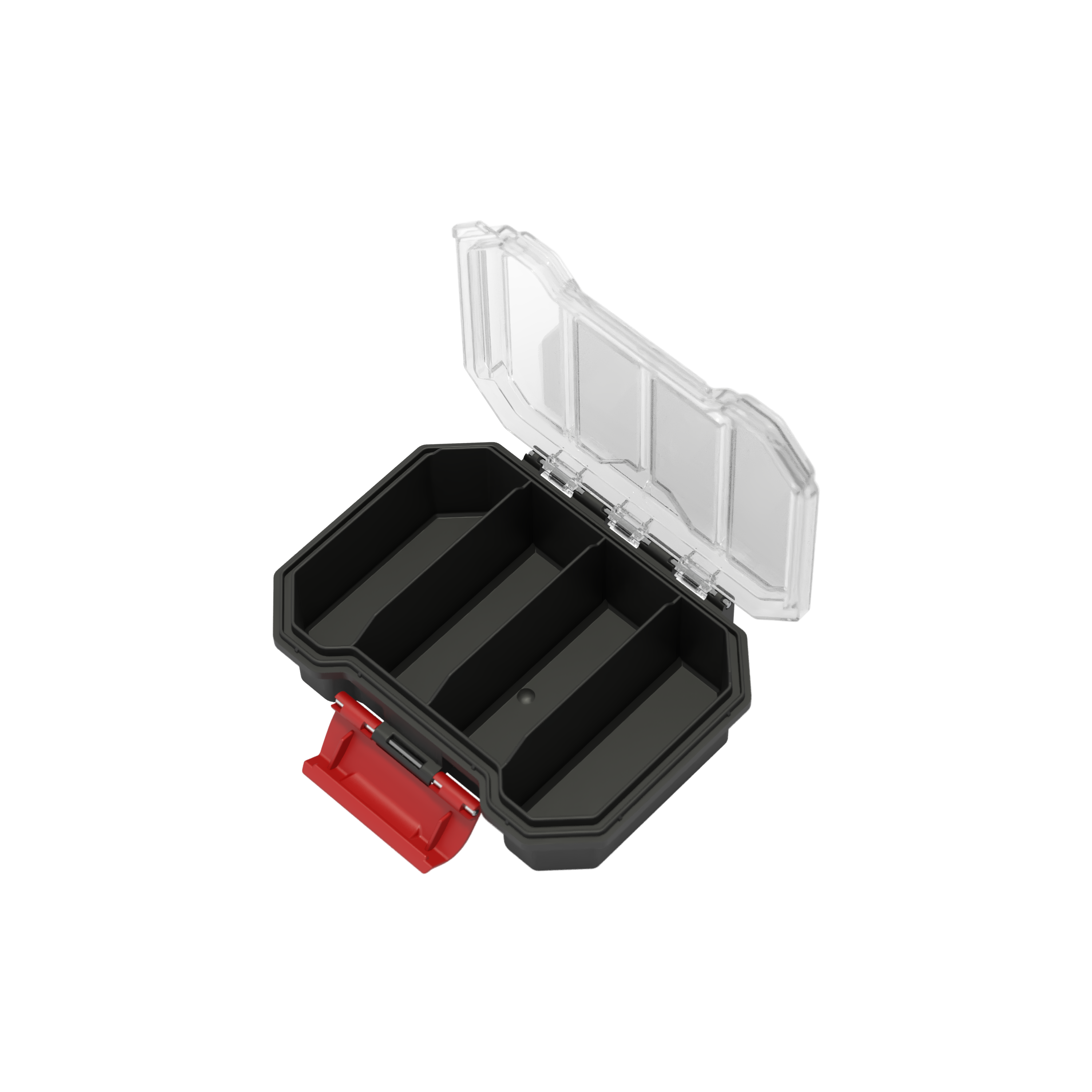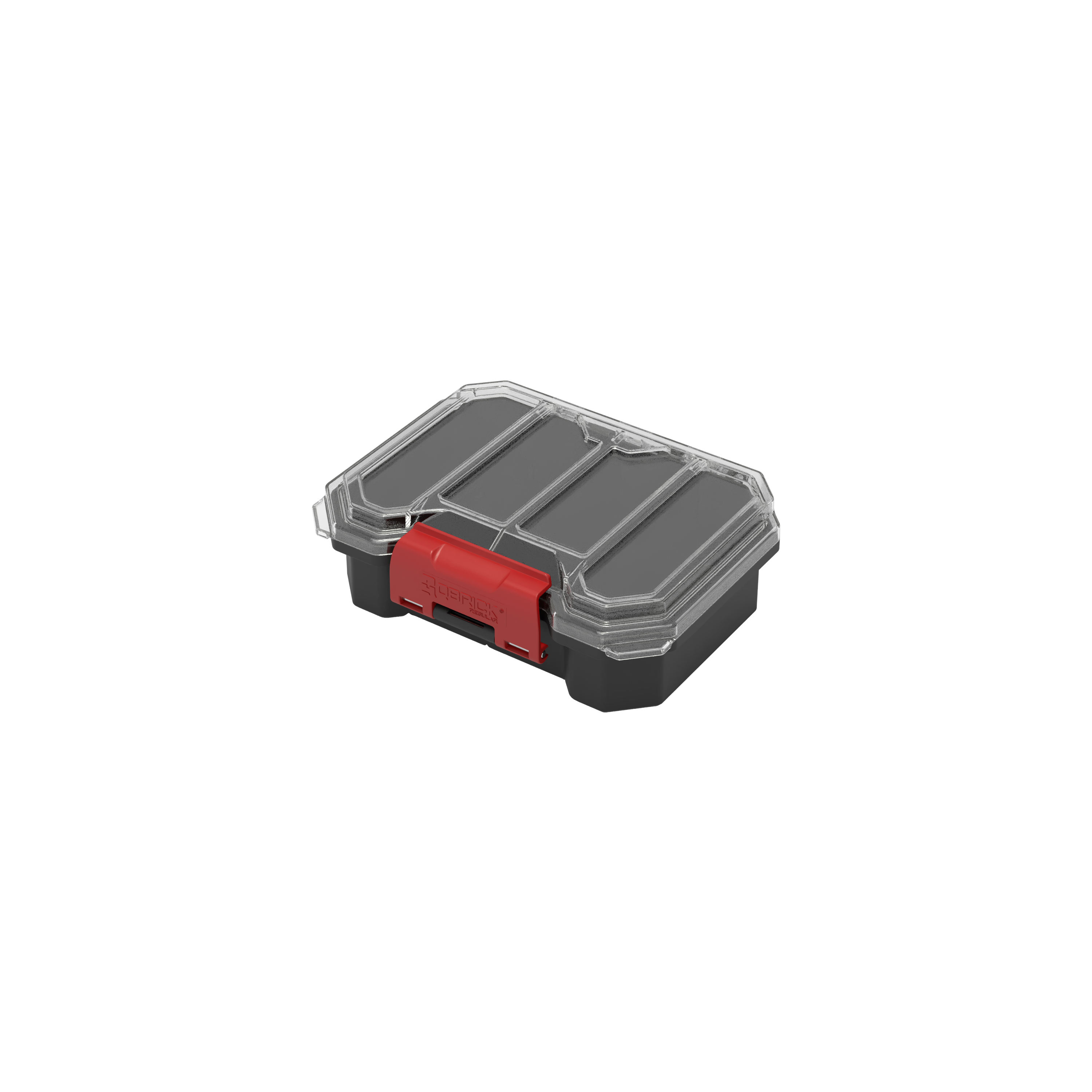 Qbrick Compact S – mały organizer z transparentnym wiekiem i czarnym korpusem. 4 długie komory, wytrzymała konstrukcja, idealny do małych akcesoriów.