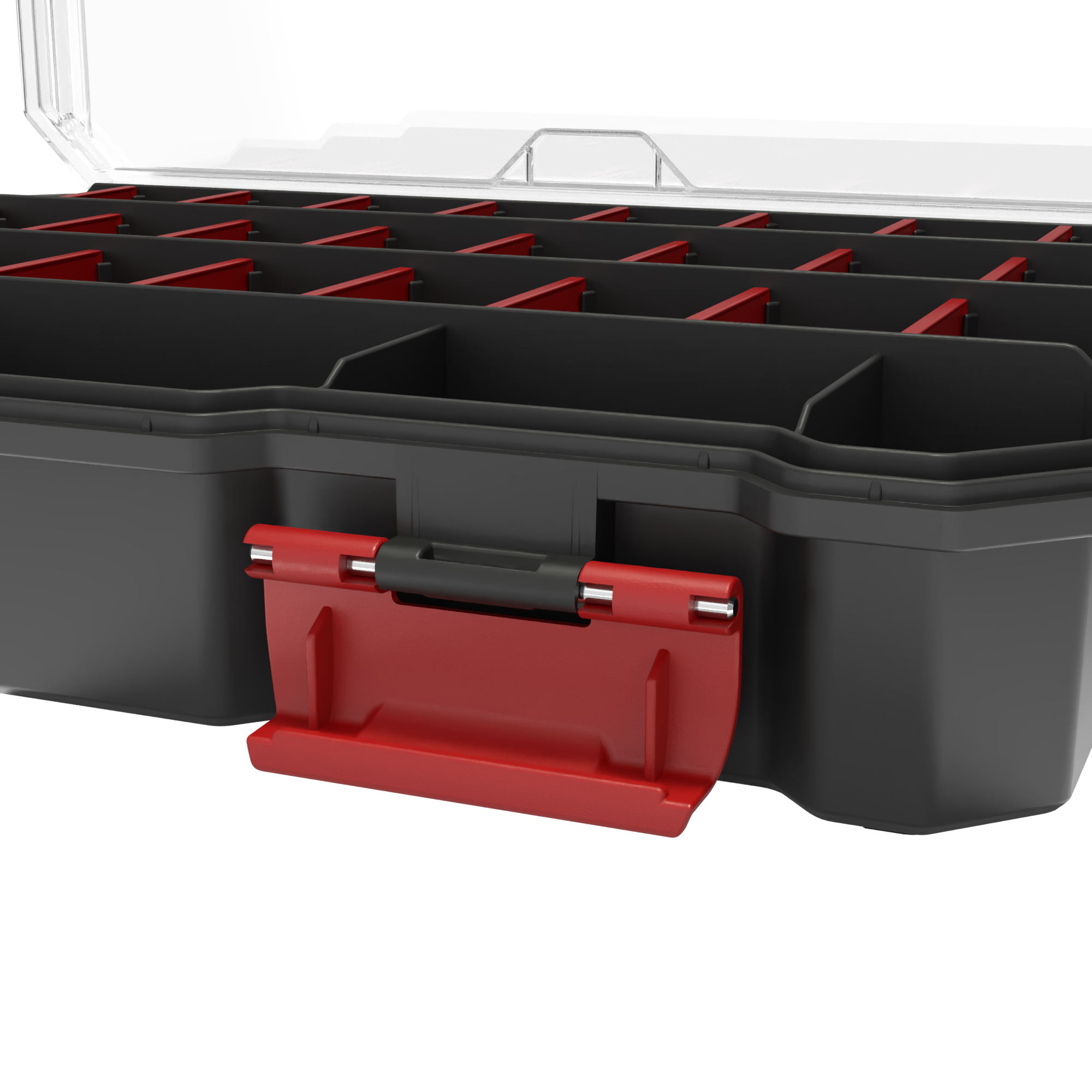 Transparentne wieko pozwala szybko sprawdzić zawartość, a czarny korpus nadaje organizerowi elegancki, profesjonalny wygląd.