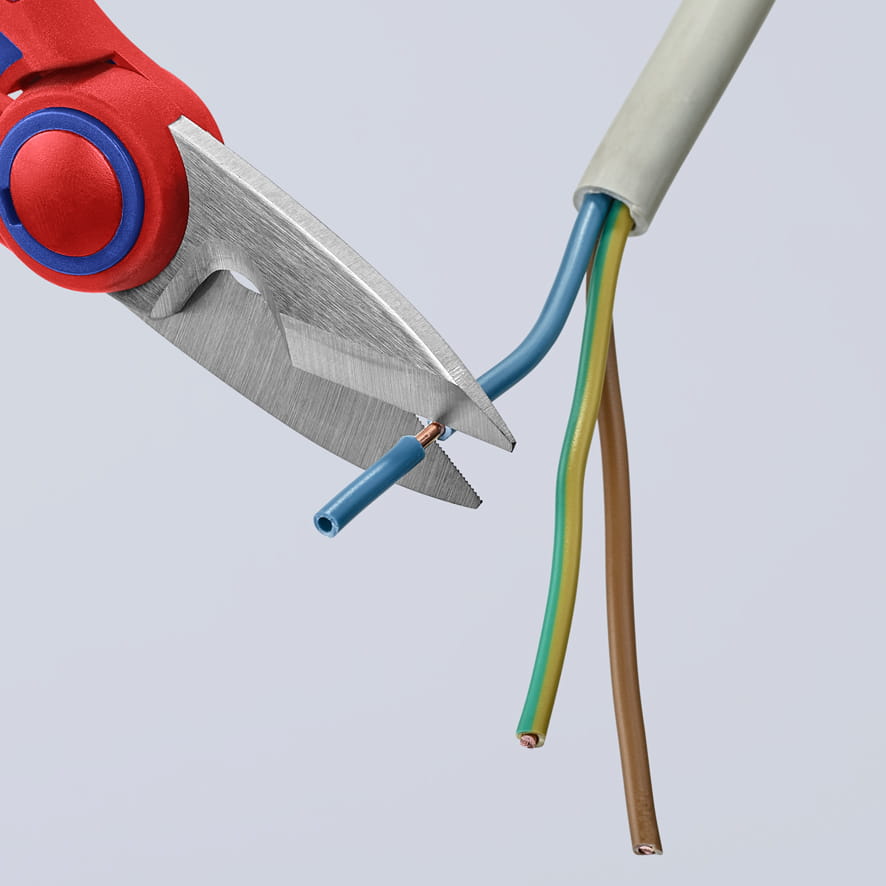 Nożyczki posiadają precyzyjnie wykończone krawędzie tnące z mikrouzębieniem, które zapewniają dokładne i kontrolowane cięcie bez ześlizgiwania się materiału. Ostrze z funkcją nożyc do kabli zwiększa uniwersalność narzędzia, a profil do zagniatania tulejek kablowych o przekroju do 6,0 mm² umożliwia wykonywanie dodatkowych prac instalacyjnych. Krawędzie tnące wykonane są ze stali nierdzewnej o twardości 56 HRC, co gwarantuje długą żywotność. Nożyczki nie są przeznaczone do cięcia przewodów litych.