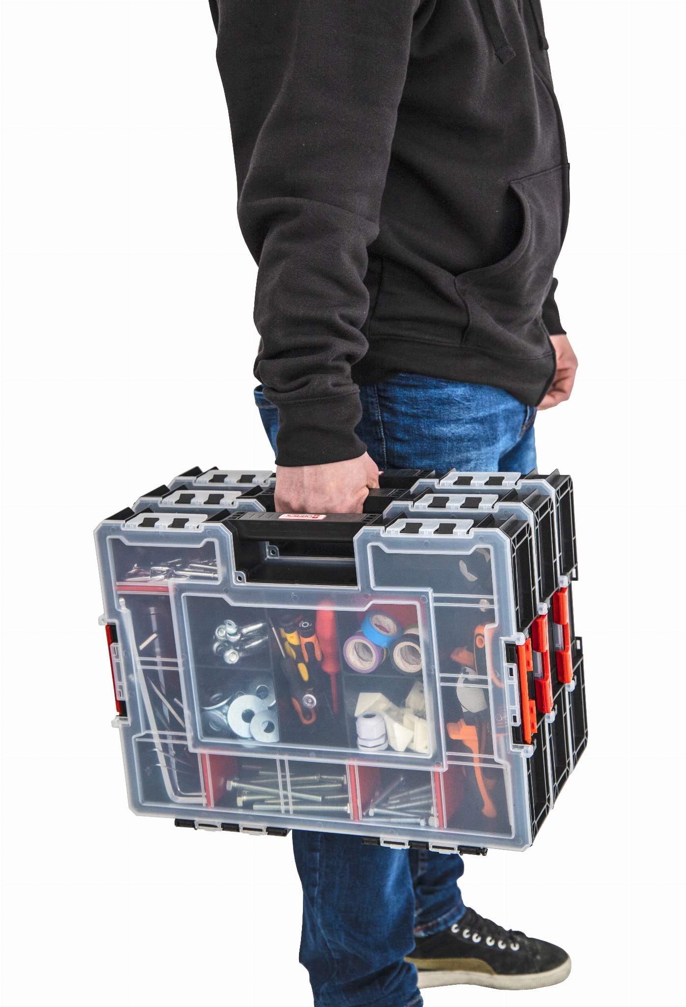 Organizer 500 Qbrick Regular to wszechstronny model organizera, idealny do użytku w każdym domu, mieszkaniu, warsztacie czy samochodzie. Został zaprojektowany z myślą o efektywnym przechowywaniu i porządkowaniu różnorodnych przedmiotów. Jego unikalna cecha to możliwość łączenia z innymi organizerami za pomocą wbudowanych konektorów. Dzięki temu użytkownik może dostosować organizację przestrzeni według własnych potrzeb, tworząc spójny system przechowywania.