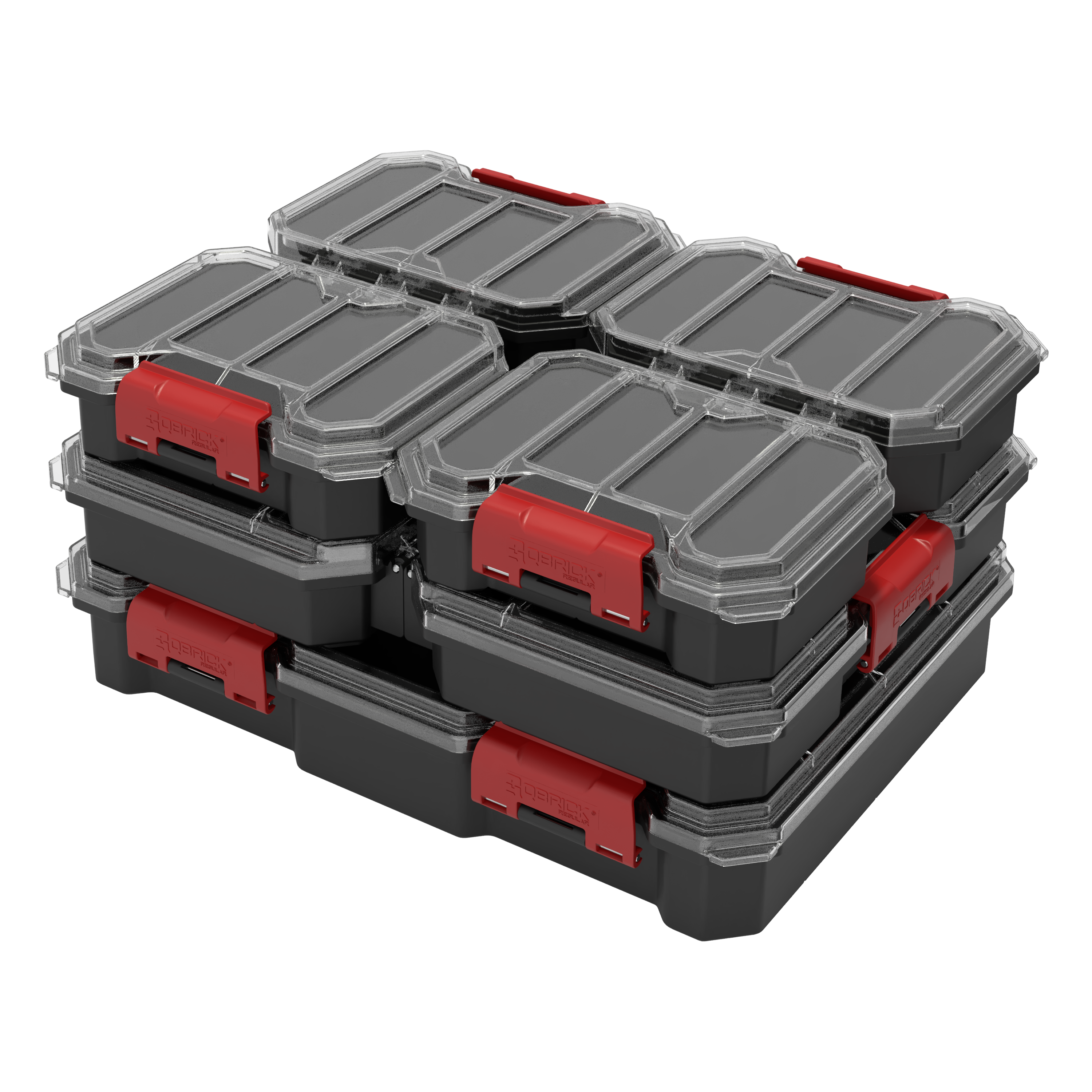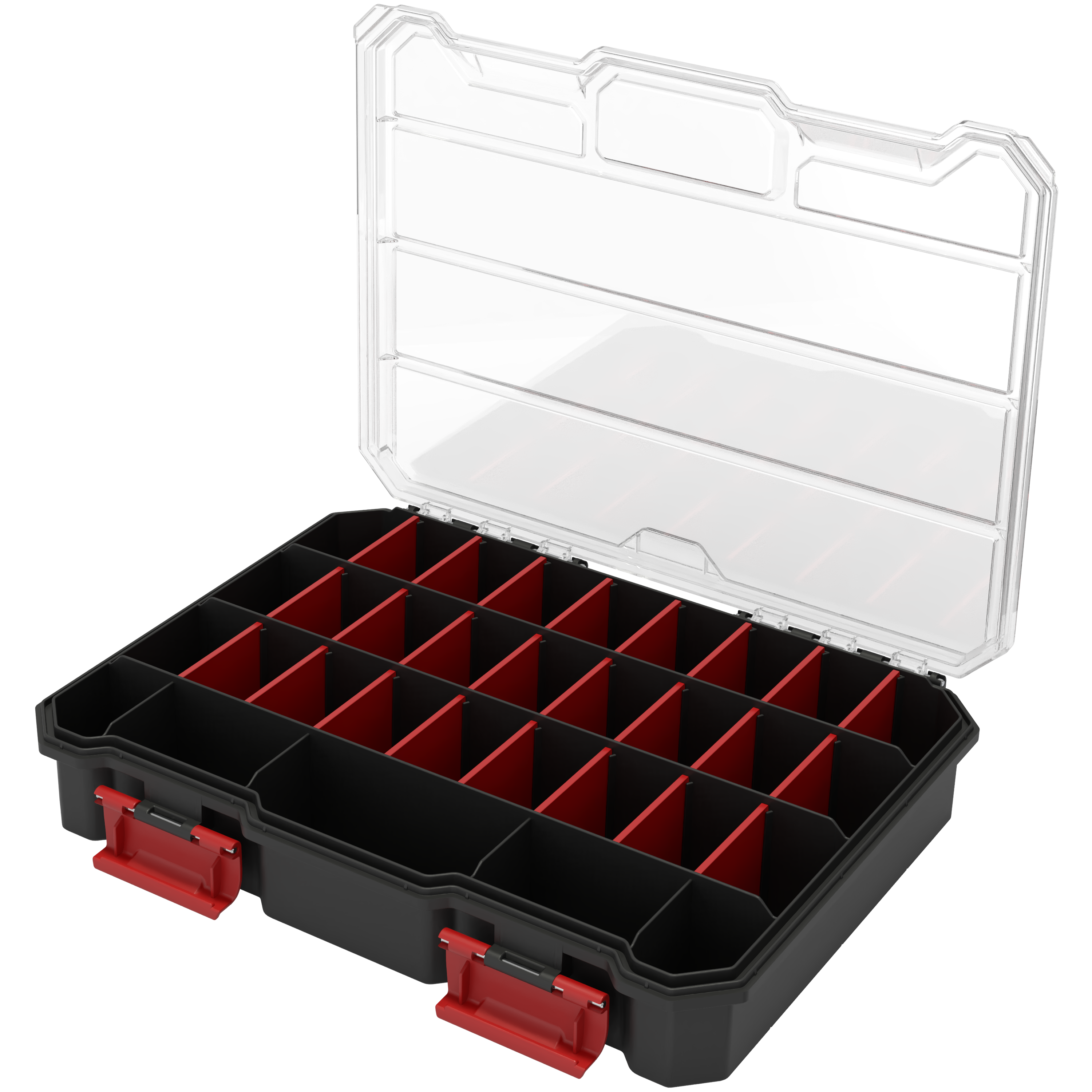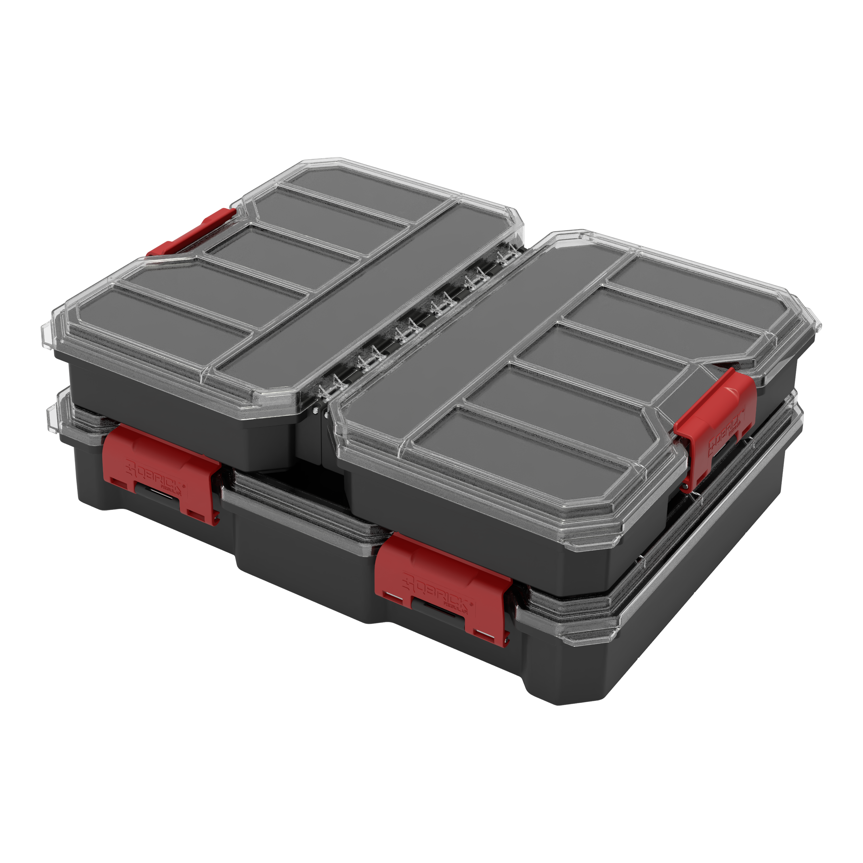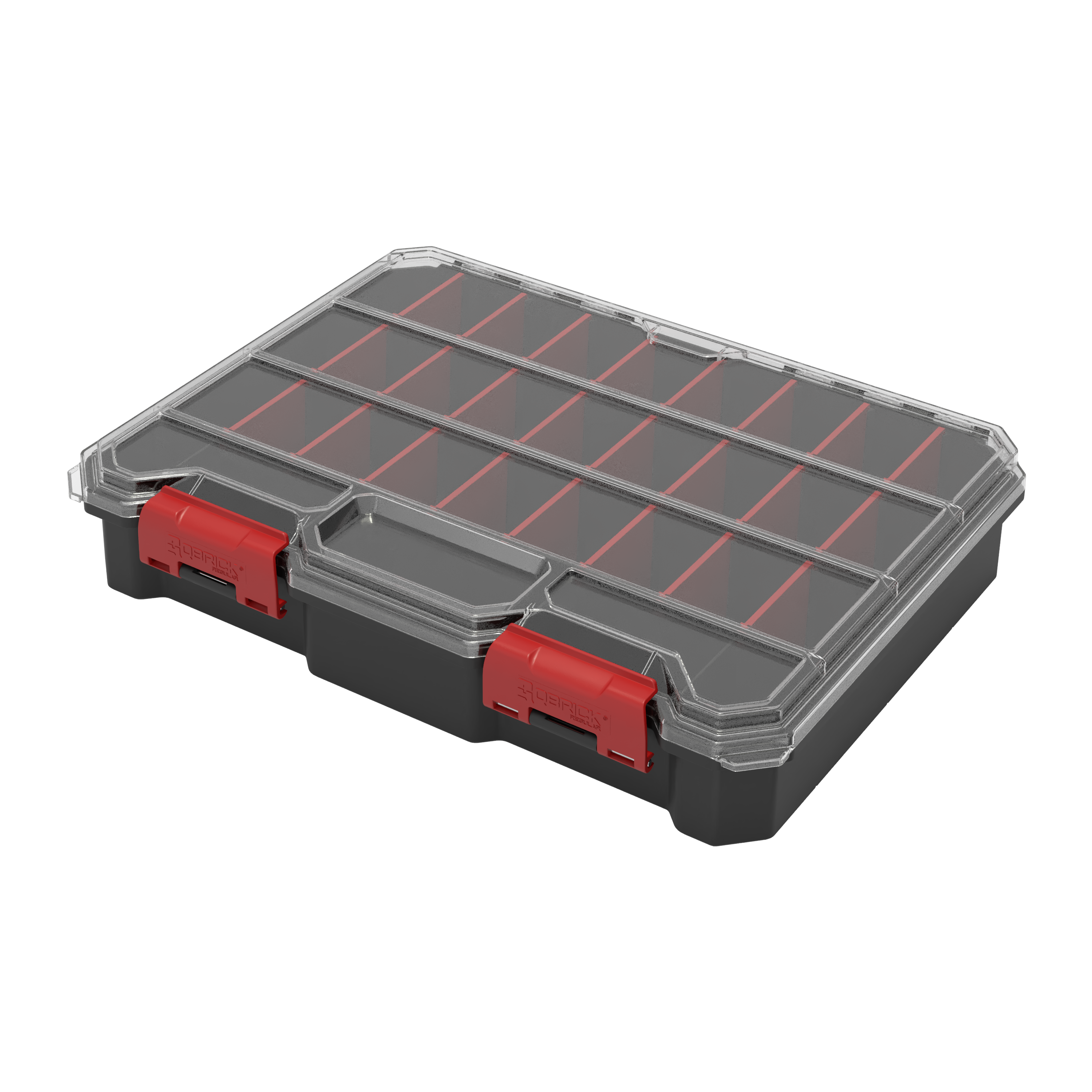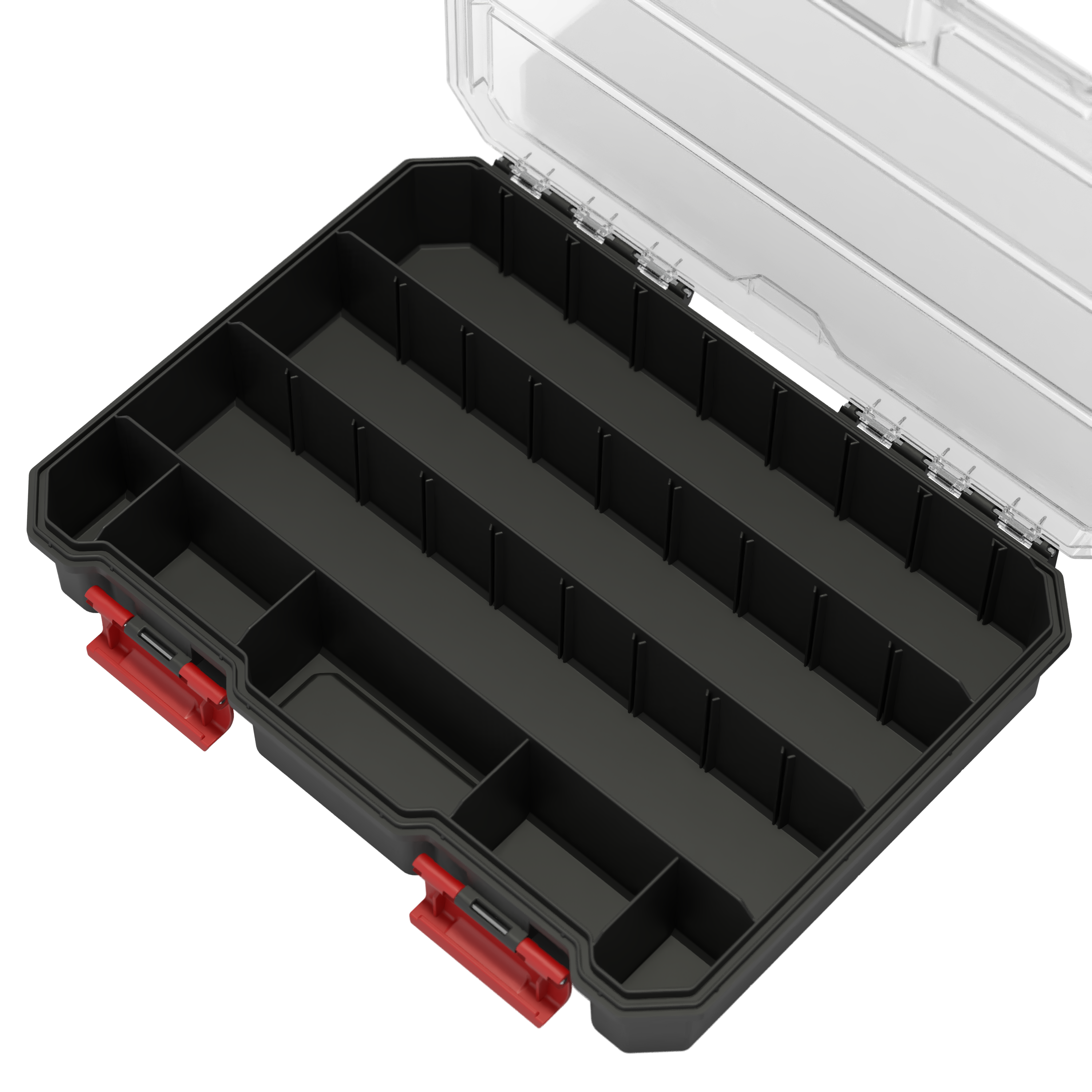 Qbrick Compact L – organizer z transparentnym wiekiem i czarnym korpusem. 24 regulowane przegrody, do 32 komór. Wytrzymała i szczelna konstrukcja.
