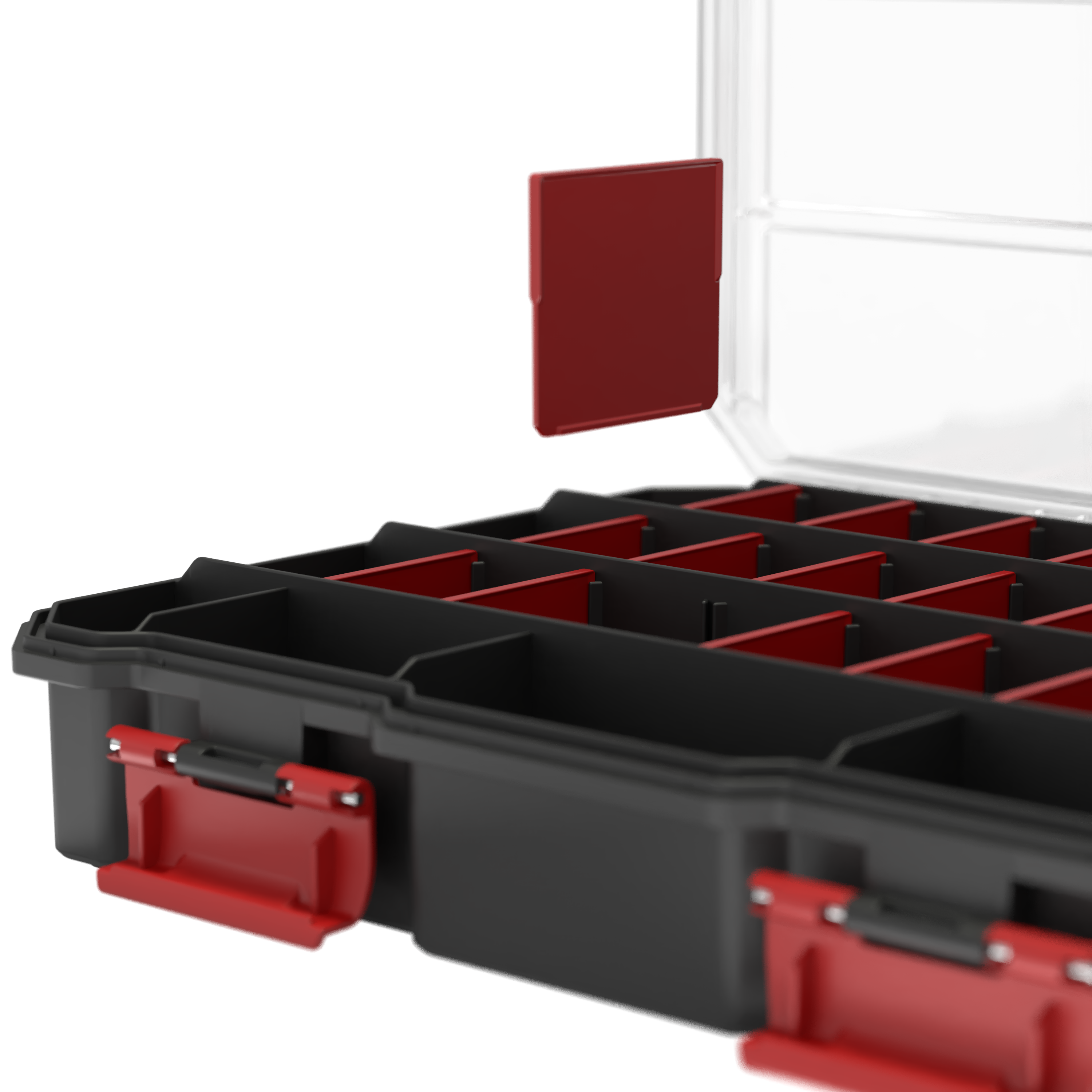 Organizer Compact L oferuje aż 24 regulowane przegrody, które pozwalają na stworzenie maksymalnie 32 indywidualnych komór. Taka elastyczność umożliwia idealne dopasowanie przestrzeni do rodzaju przechowywanych elementów, takich jak: