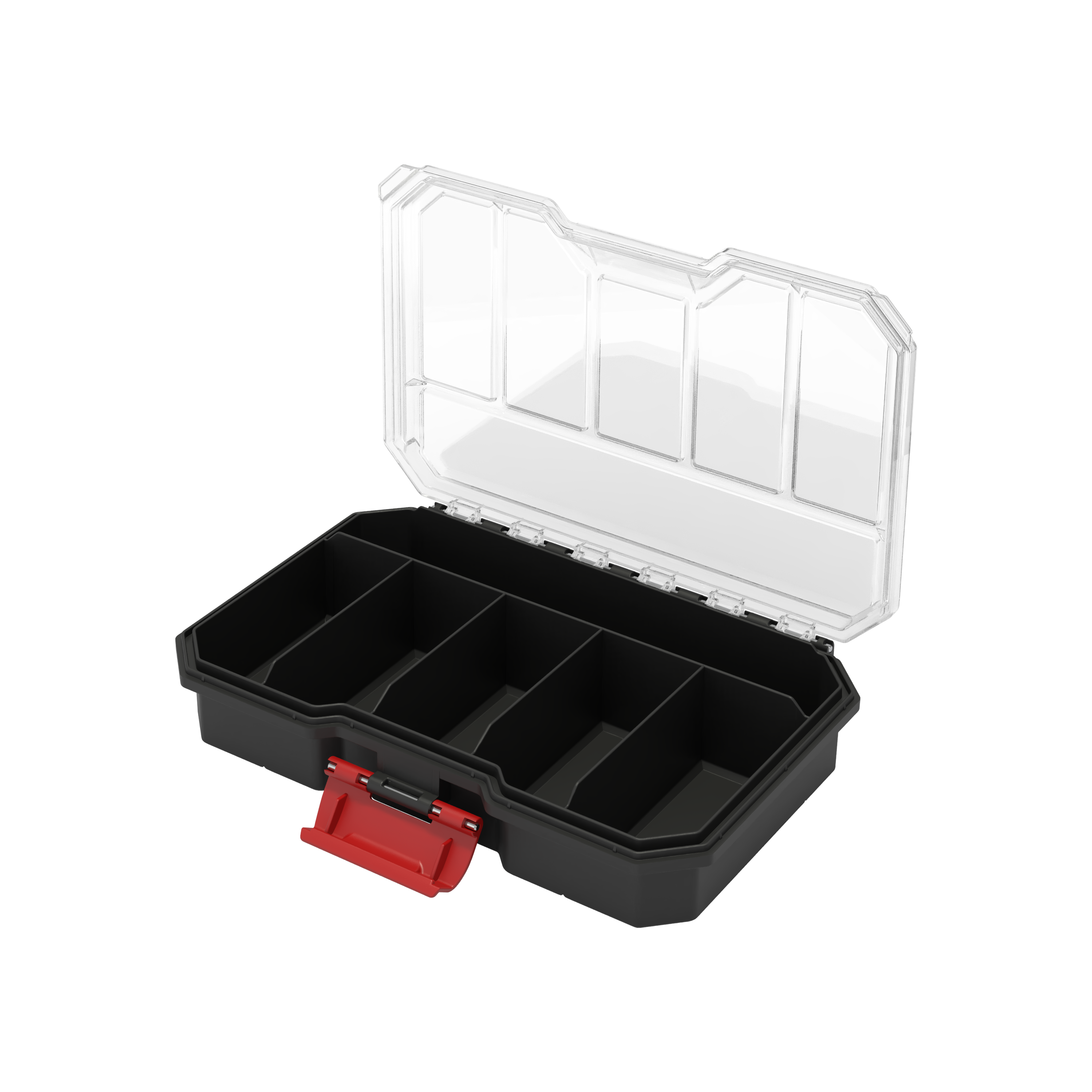 Qbrick Compact M – organizer z przezroczystym wiekiem i czarnym korpusem. 6 komór, solidna i szczelna konstrukcja. Idealny do pracy w warsztacie i terenie.