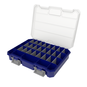Wymiary zewnętrzne organizera to 290 × 220 × 54 mm. Dzięki temu zajmuje niewiele miejsca, a jednocześnie oferuje dużą pojemność roboczą. Idealnie nadaje się do przechowywania i transportowania drobnych elementów montażowych, końcówek, wkrętów czy złączek.